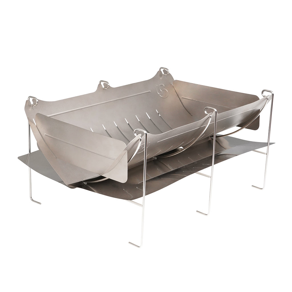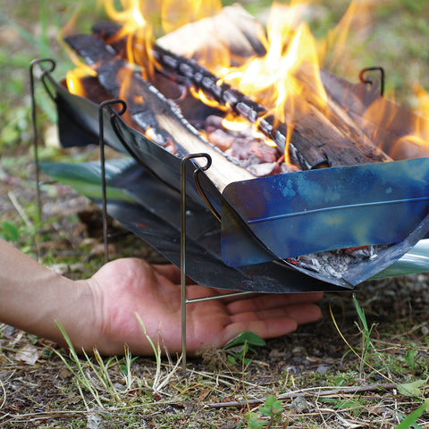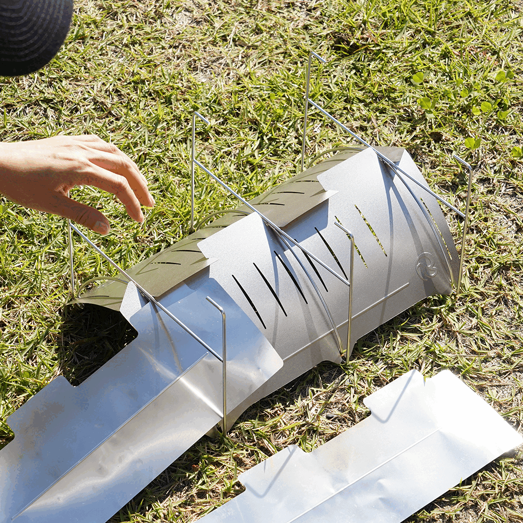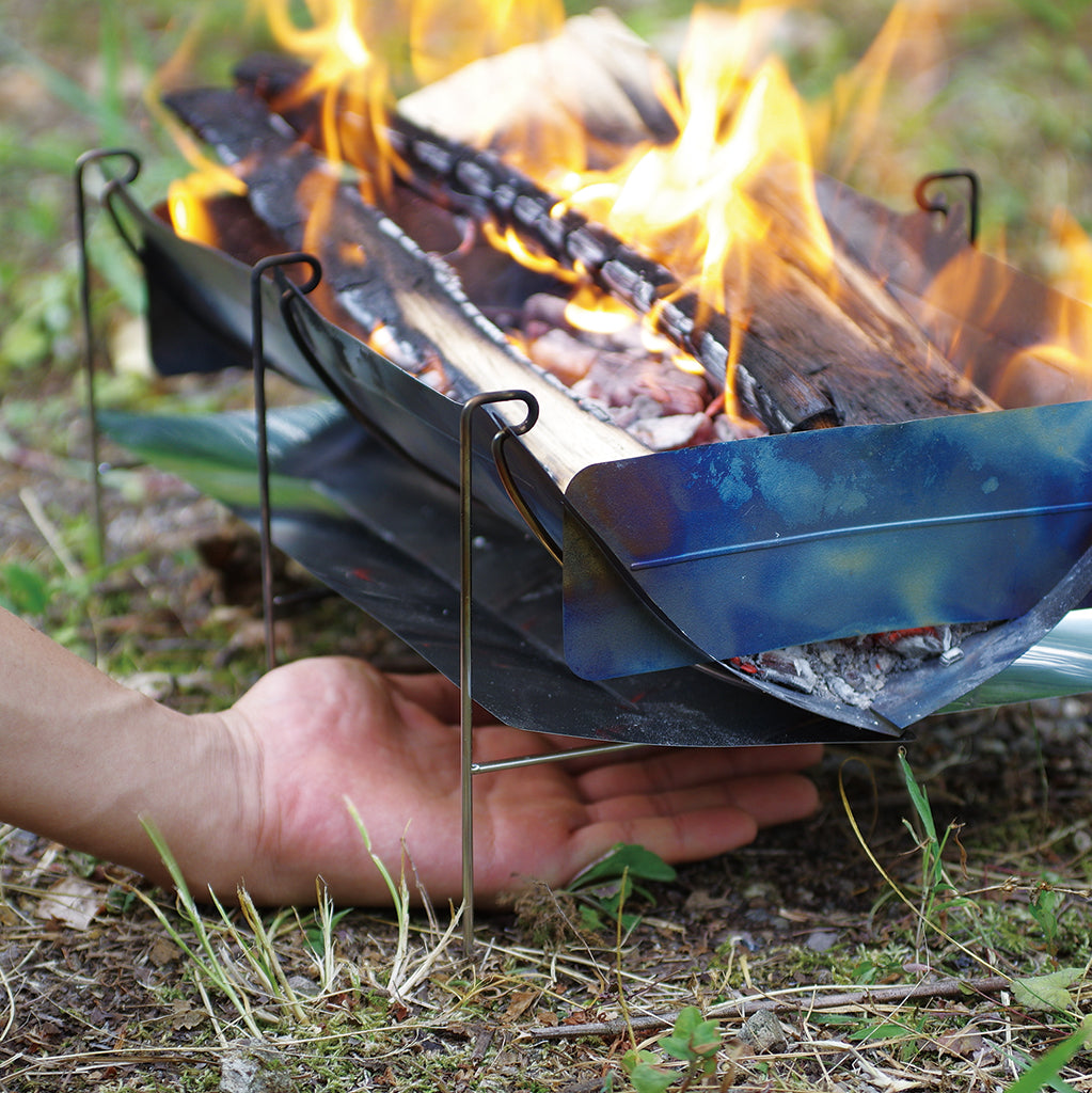焚き火台TABI(グリルエクステンション付き)の下に取り付け、芝生や地面へのダメージを軽減する遮熱板です。TABI本体のケースに一緒に収納して持ち運びことができ、組み立て時に差し込むだけで焚き火台の使用感を損なうことなく使うことができます。