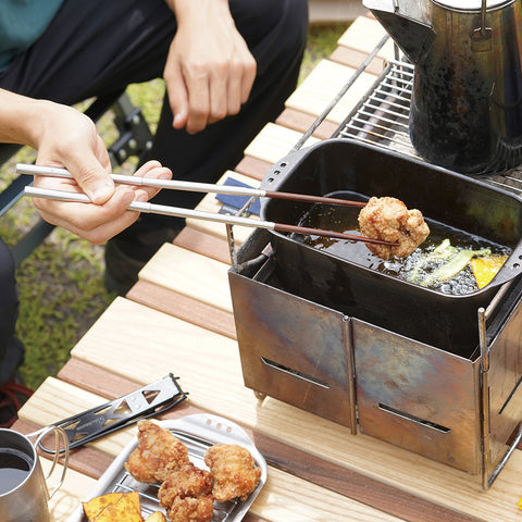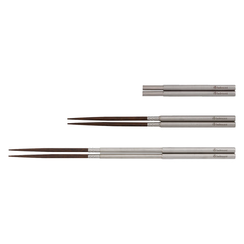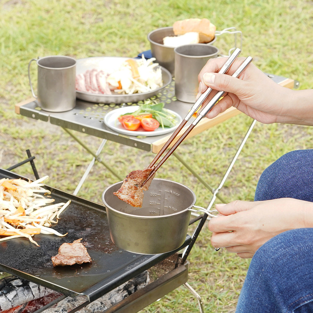 既存商品のフィールドスティックの長さから、テレスコ部分を引き伸ばせば菜箸に丁度良い30cmの長さになります。調理の際は菜箸として使い、食事の際は22cmのお箸として使えます。収納はフィールドスティックと同じ125mmに収まり、一本あると便利なアイテムです。