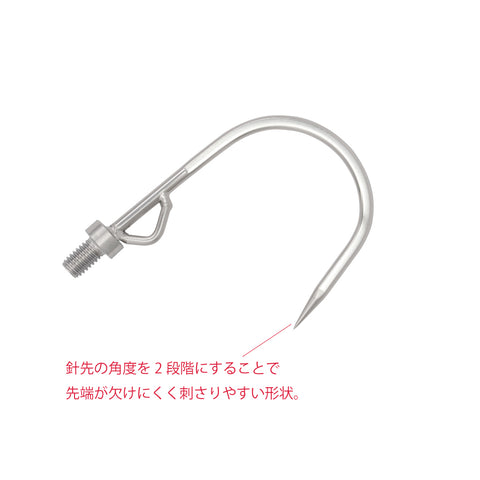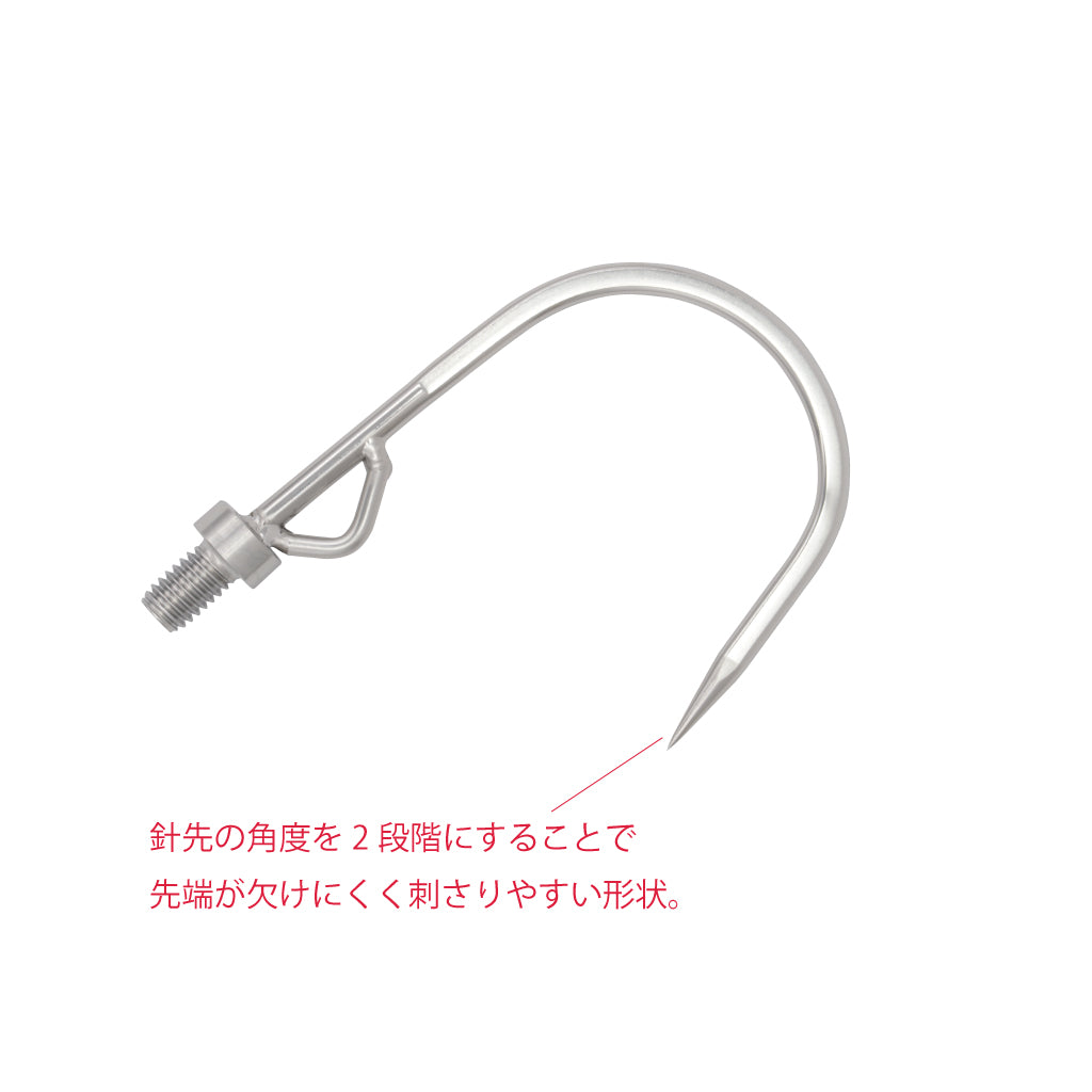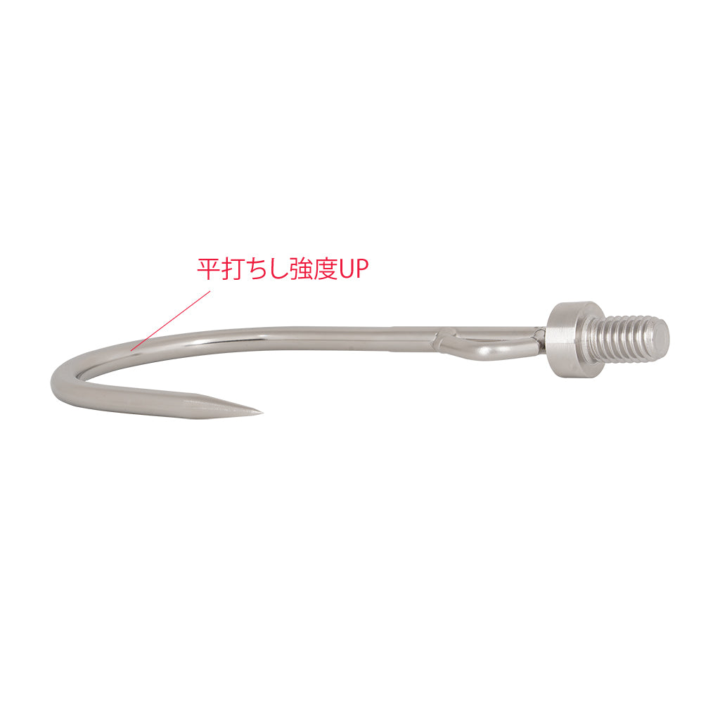 這款不鏽鋼魚鉤採用直徑 7 毫米的扁平鍛造鋼絲製成,強度極高。鉤尖設有繩孔,方便落鉤。鉤尖採用兩段式錐形設計,不易崩裂,也較容易插入。
